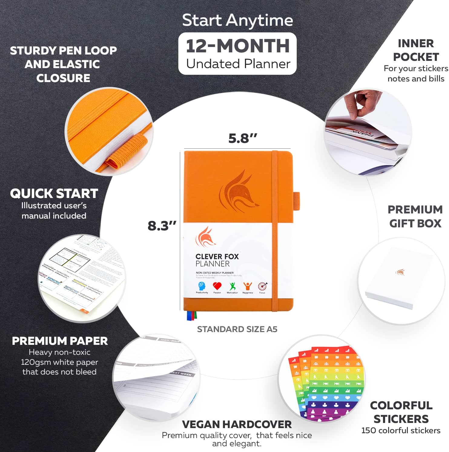 - FREE QUICK START GUIDE & STICKERS – This planner and organizer for women and men comes with a detailed step-by-step illustrated user guide for a quick start, unlike other planners that will leave you wondering how to use them after the purchase. It also comes with 150 colorful planner stickers and in a premium gift box keepsake packaging. There is absolutely no reason for you to look any further. Clever Fox planner is guaranteed to work, or we will give you your money back!